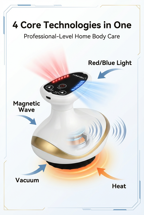 LUMIFIRM® is an advanced 4-in-1 body sculpting device engineered to elevate your at-home body care routine. Featuring 6 adjustable vacuum levels, 6 heat settings, red & blue LED light care, and magnetic wave vibration, it works to support smoother-looking skin, improved firmness, and enhanced circulation.